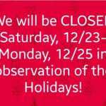 We will be CLOSED Saturday, 12/23- Monday, 12/25 in observation of the Holidays!